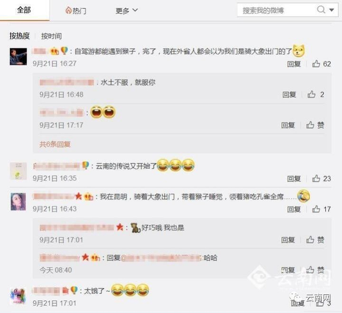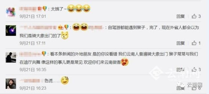 网友徐豆豆Jane也忍不住为云南打个CAll,他表示,看本条新闻的外地朋友,是的你没看错,我们云南人普遍骑大象出门,猴子常常与我们在迪厅共舞,像这样的事儿更是常见,欢迎你们来云南做客。