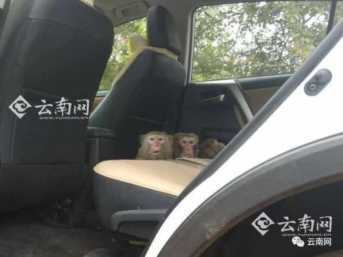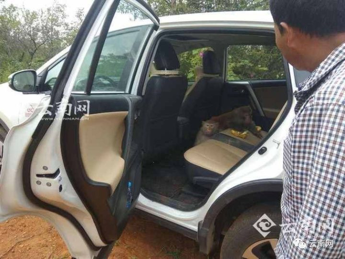 9月16日,是外省游客赵先生和朋友一行自驾游云南的最后一日。当他们驾车行驶到昆明哨关段停车休息时,由于车门没关好,后座又放着一把香蕉,没想到,他们再次上车时发现车内竟然溜进三只猴子。