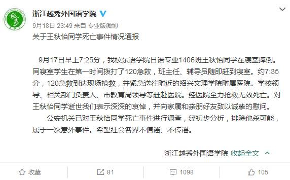 事发后,浙江越秀外国语学院在官方微博上发了一则“关于王某某同学死亡事件情况通报”: