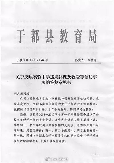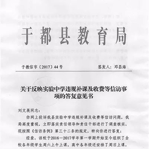 9月20日,于都县委宣传部副部长陈桂华在接受北青报记者采访时表示,于都实验中学组织周末补课问题“基本属实”。一份3月16日发布的《意见书》显示,于都县教育局调查核实认为,于都实验中学组织周末补课问题“基本属实”,但收取补课费“与事实不符”。