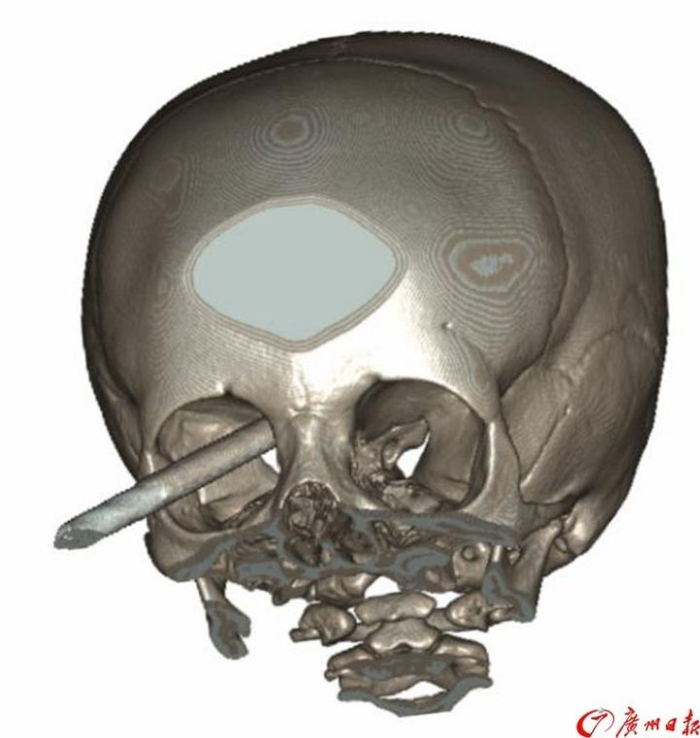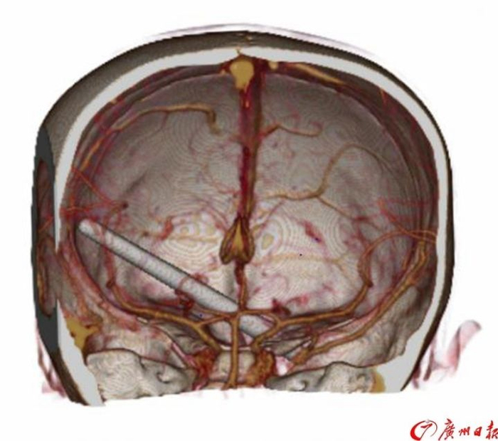 小宝到达市妇儿医疗中心时仍然是头插筷子的状态,生命体征平稳,神志清晰,四肢肌力、肌张力正常,可以自主睁眼,但右眼肿胀严重,医生无法观察眼球状况。CT检查重建影像显示,不锈钢筷子从右眼球外下方打侧和眼球“擦肩而过”,穿过右眼眶内上壁穿入颅底,筷子位置双侧大脑前动脉下方,末端直达左颞叶,距离左大脑中动脉前方只有9毫米,插入部分达11厘米,“相当好彩的是,筷子完美‘避开’了颅脑内的大动脉,没有伤及重要血管。”接诊的陈医生介绍。