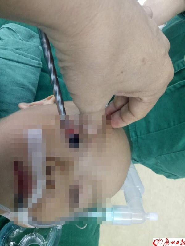 4个多小时后,家长带着小宝从惠州赶到广州市妇女儿童医疗中心急诊。凌晨3时多,多学科合作手术取出筷子。不幸中的万幸是,筷子没有损伤到小宝的颅内血管,似乎也没有损伤重要神经组织,目前小宝情况稳定,预计今天(22)可以从PICU转入到普通病房。