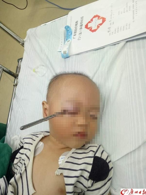 20日晚上7时多,是1岁7个月大的小宝(化名)的晚餐时间。妈妈用筷子戳了个肉丸子,让他自己拿着吃。小宝蹦蹦跳跳地边吃边跑,不慎摔倒,可怕的事情发生了:不锈钢筷子从他戳进右边眼眶,直入颅脑!