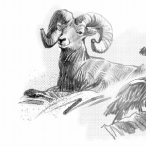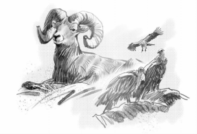 现在,他的心情很沉重。他不忍心就这样抛下这只已经痴呆的老岩羊而去。生命总该有个尽头。他为这只老岩羊祈祷。于是,他割下这只老岩羊的首级,将长进后臀皮肉里的犄角尖拔出,面朝东方搁置好羊头,依然保持着它曾经的尊严。他把老岩羊的躯体肢解后放在大圆石上,用枯草揩净手和折扣刀,上马离去。