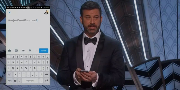 颁奖典礼进行到一半时,吉米再次当众挑衅特朗普,拿他爱发推特开涮: