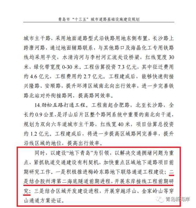 在《青岛市“十三五”城市建设基础设施建设规划》中提到“结合胶州湾第二海底隧道前期进程,开展东岸接线工程前期研究”。