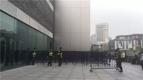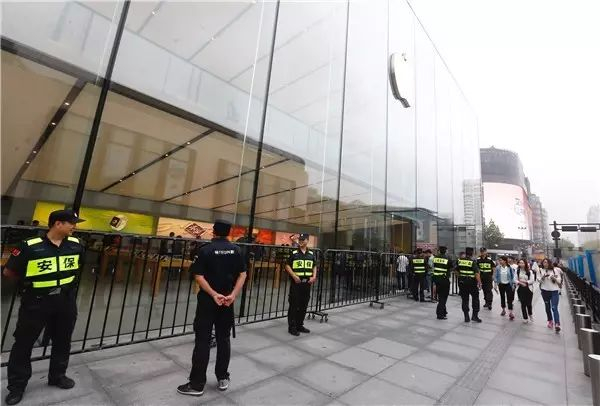 8:05,记者来到平海路的苹果旗舰店,远远就看见门口黑压压的一片,还有很多很多保安,因为穿着荧光色背心,特别显眼,在延安路的交叉口,还单独安排了两人站岗……那气势真是没话说。