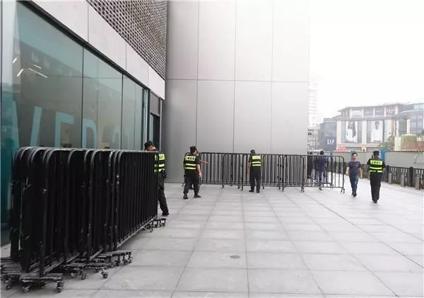8:43,记者准备离开现场,恰好看到保安们又忙碌了起来,忙着撤栅栏……