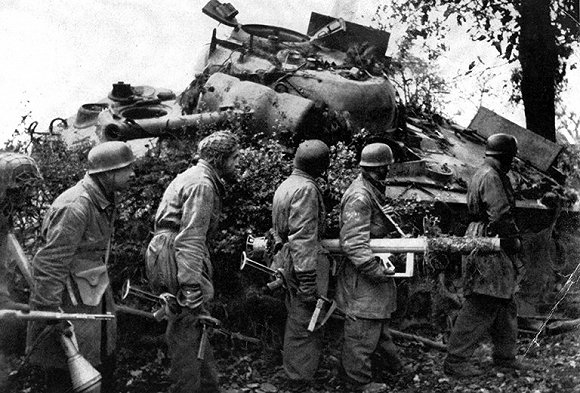 在诺曼底地区一处村庄,德军士兵在一辆谢尔曼坦克的残骸外检查。图片来源:德国联邦档案詹姆斯·琼斯(James Jones)非常乐于戳穿“强大的谢尔曼坦克”这一“谣言”。