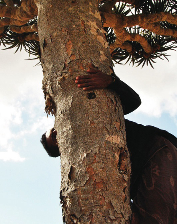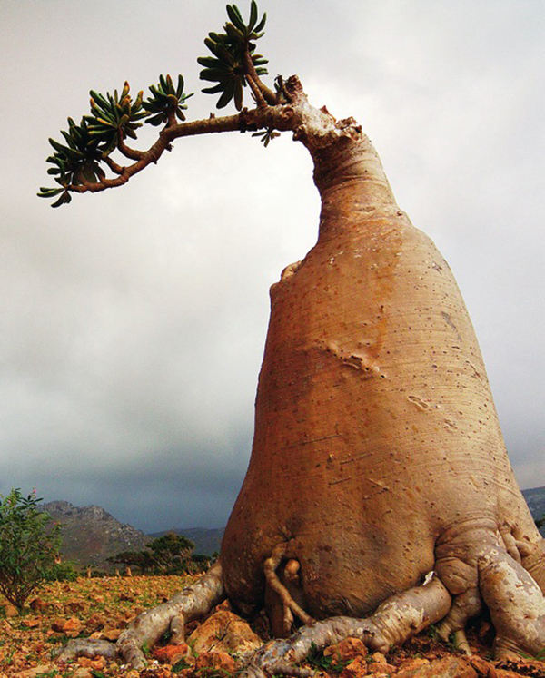 每当我们意识到脚下这块土地是全世界独一无二的,兴奋之情便无以复加。第三天,我们开始了通往费尔姆欣(Fermhin)森林的上山之路,那里就是该岛最大的龙血树聚生地。我们手脚并用地沿石灰岩陡坡攀爬,终于登上一片大平地——耸立在眼前的是成千上 万株“天生异象”的龙血树,仿佛地上插满了巨伞而伞盖一律朝上反翘,多节的枝桠如伞骨般向四面八方伸展,一直辐射到视野尽头。 穿行其中,似已出离凡尘,闯入了一个壮美又怪诞的奇境异界。