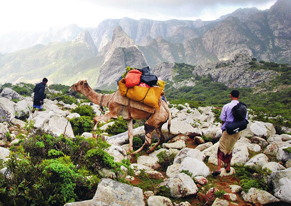 这种传奇之树发现于岛上哈杰希尔(Hagghier)山脉深处,要徒步数日方得一见。山势巍巍,前路漫漫,随行的除了永远热情似火的巴萨姆,还有一匹壮实的骆驼和赤脚而行的赶骆驼人。一路上我们以豆子为主食,晚上搭帐篷宿营,一整夜的狂风呼啸总是连着清晨的一场刺骨寒雨。条件纵然严酷,哈杰希尔山依然难掩其美 : 苍翠起伏的群山、险峻崎岖的崖壁透着苏格兰高地的神韵,时有波光粼粼的溪流穿过一片粗壮的棕榈树,又让我们感到似乎身处非 洲某地。