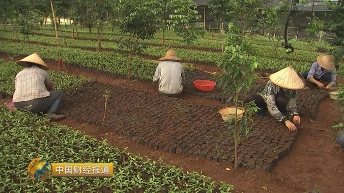 沉香树,每年五月份开花、结果。每个果实里面,有两个像小蝌蚪一样的种子,只有选取12年树龄以上,优质的母树种子,才能育苗。种一亩沉香树,大约需要4.5公斤种子。用树棍,在营养杯中点一个坑,再把种子放进去,当地人称作“点种育苗”。幼苗生长11个月后,就可以分发给农户移栽大田了。