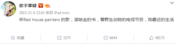 李健不止一次谈过读书,“所谓读书的意义,大概就是让人眼界更开阔,对自我有更清醒的认识,而不至于狂妄。一个人读的书越多,越会意识到自己的匮乏。”