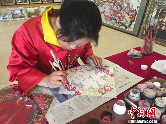广灵剪纸的工艺比较复杂。一个成品要经过图样设计、刻字、点染、装帧等38道工序,是一种现代机器生产无法取代的纯手工工艺。图为广灵剪纸的“点染”工序。 杨静 摄