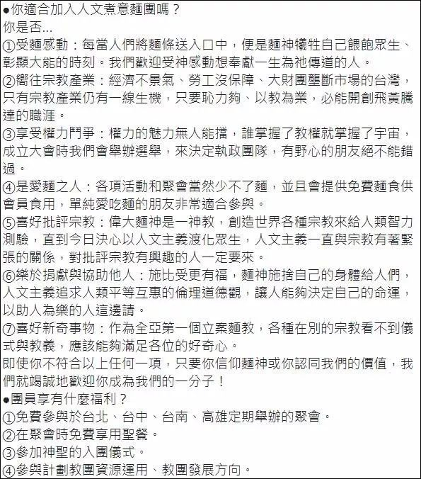 在招募帖子中,该团列出七条适合加入的要求,分别为:受面感动、向往宗教产业、是爱面之人、享受权力斗争、喜好批评宗教、乐于捐款与协助他人与喜好新奇事物……
