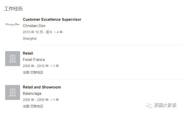 从巴黎高等管理学院毕业后,她在纪梵希门店做过一年实习生,之后在巴黎世家和芬迪(Fendi)两家顶尖奢侈品牌门店做销售。