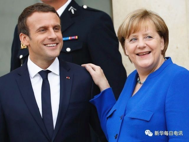 7月13日,爱丽舍宫,出席法德峰会的德国总理默克尔(右)与法国总统马克龙话别。(新华/法新)
