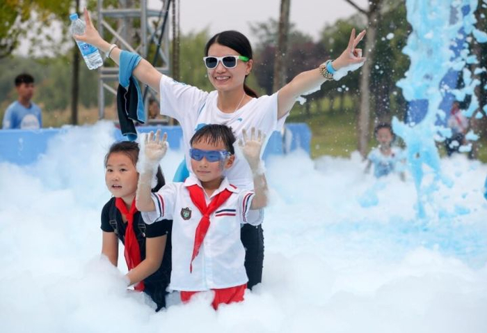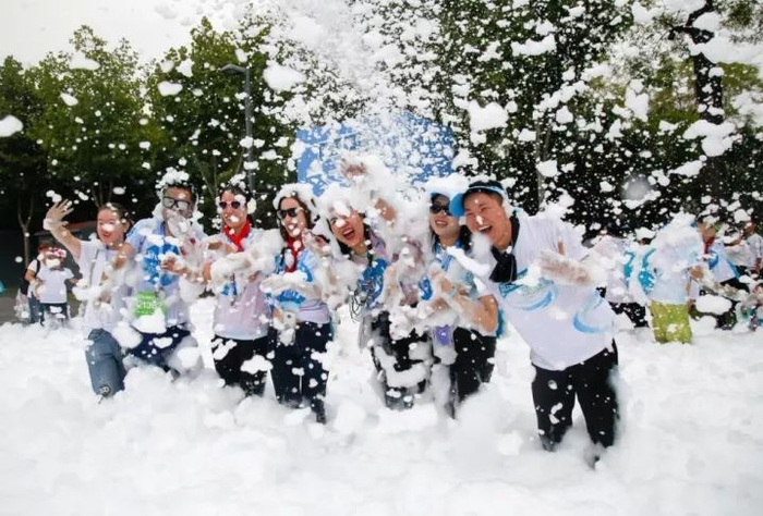 下午2时,暖场活动中,所有参与者围成一个大圈进行反旋跑,此时欢快的音乐中,一大堆白色泡泡从天而降,所有参与者瞬间陷入狂欢。