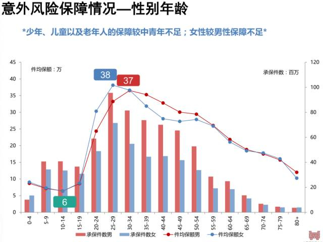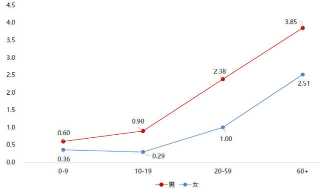 从性别角度看,中国男性的意外伤害风险明显高于女性,男性的总体意外伤害风险约为女性的1.3倍,尤其是中青年(20岁-59岁)阶段,男性意外伤害风险更是女性的2.38倍。
