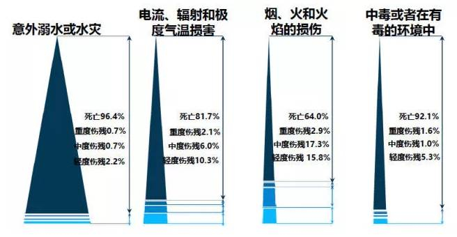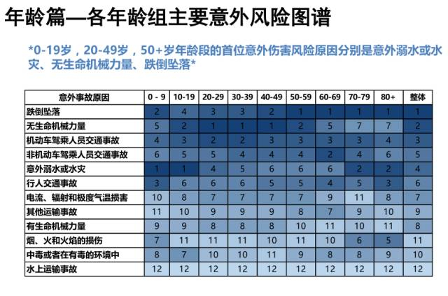 总体来看,从老年人到中青年,再到青少年,意外伤害风险概率逐步减小。