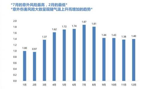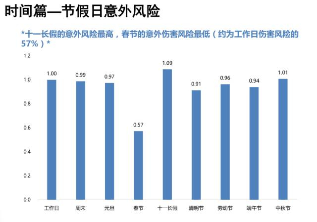 而春节期间的意外伤害风险最低,约为工作日的57%,“十一”长假较其它时间段高,较工作日期间高10%。所以,对于“十一”出游的你来说,一定要注意啦。