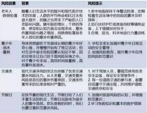 针对意外伤害风险,科学认知危害因素,并通过有效的防御措施以降低危险因素至关重要。下面这些风险提示,大家要看仔细了。