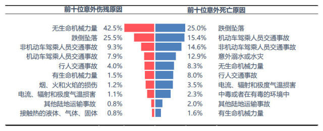 因跌倒坠落导致意外伤害的事故中,死亡占比达半数以上 ,因无生命机械力量导致意外伤害的事故中,更常见的结果是轻度伤残。