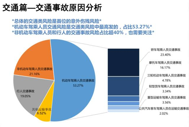 从细分事故原因看,跌倒坠落是首位的意外风险原因;从大类事故原因来看,交通类风险是第一位的意外风险原因。