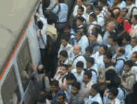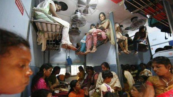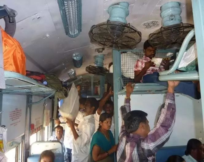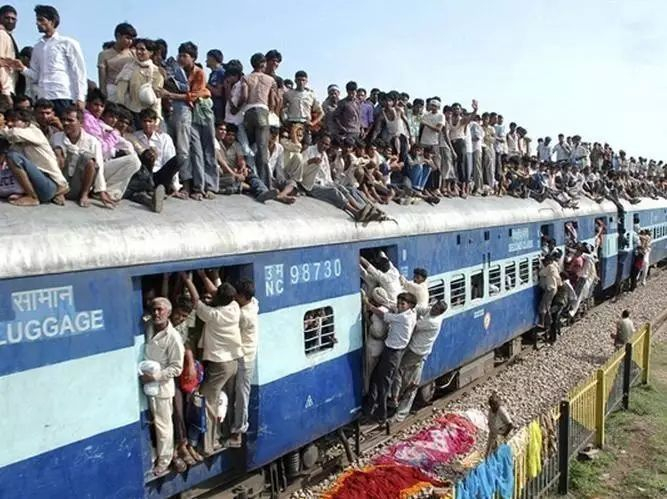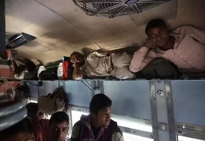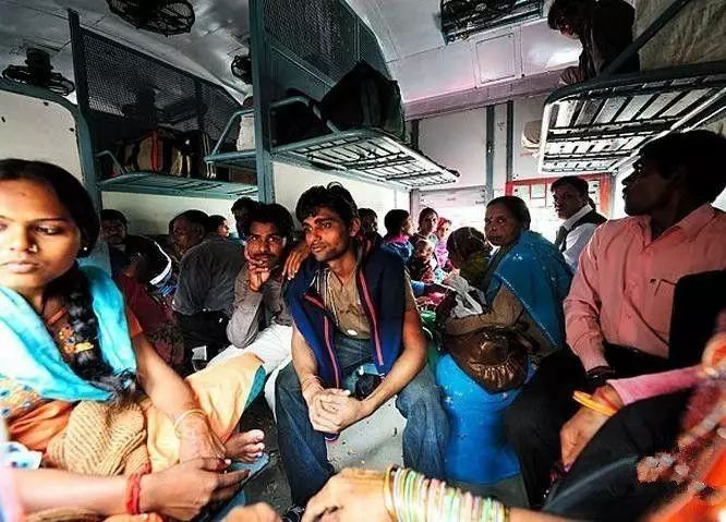 印度火车车厢往往十分拥挤,所有的座位、架子、车厢间的连廊,甚至连厕所都挤满了人,还有乘客直接挂在车门上。