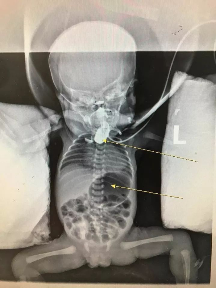 造影剂检查显示,孩子近端的食管闭锁,因食管瘘的存在,胃部有大量胀气