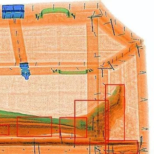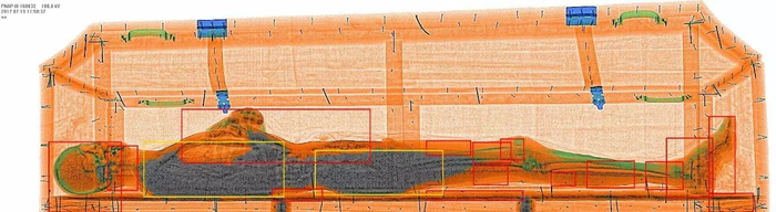 印度斯利那加机场要求安检仪检测的棺材的安检扫描图。当地军方不理解为什么图片中有阴影部分看不清。实际上对人体器官等特殊物体扫描,中国安检设备通过调试某些参数后是完全可以达到的。“同方威视”公司提供