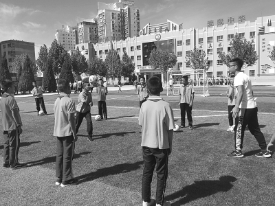 | 阿克苏市第九小学的足球场上,体育老师吕泽武正在训练足球社团的孩子们练习头顶球。本报记者 李笑萌摄/光明图片 |