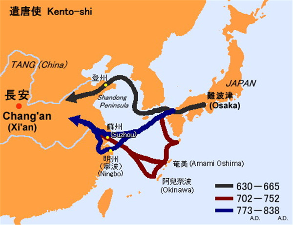唐代是中日文化交流具有代表性、也最密切的时期。唐人认识日本人是从遣唐使开始的。而随遣唐使被派遣往唐朝的,一般是留学生或僧人,学习的事物以儒家文化和佛教文化为主。过去日本与朝鲜半岛友好之时,会在朝鲜半岛北岸登陆,然后经陆路进入唐朝。7世纪中叶,新罗统一半岛大部分地区,由于新罗与日本交恶,只得改为由海路直接前往中国。《新唐书•东夷•日本》载:“新罗梗海道,更繇明、越州朝贡。”从此,距离最近的唐朝港口城市明州便成了遣唐使登陆及离港的重要口岸。