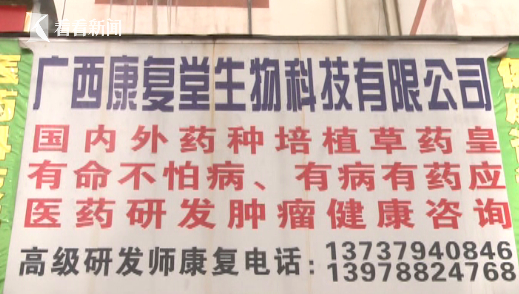 记者注意到,在南宁康复路上的这家药店里醒目挂着“ 广西康复堂生物科技有限公司”,而在店铺门头上,也悬挂有“中国民族医药(肿瘤科)科技创新杰出人才”的标语。此外,各种关于治疗肿瘤、研发肿瘤秘方的宣传牌也格外醒目。进入店内,墙壁旁这一堆白色塑料桶就装着一些药材,环境卫生让人堪忧。当记者想询问他们的店是否有相关营业证件时,店里的人员立刻把门关上。