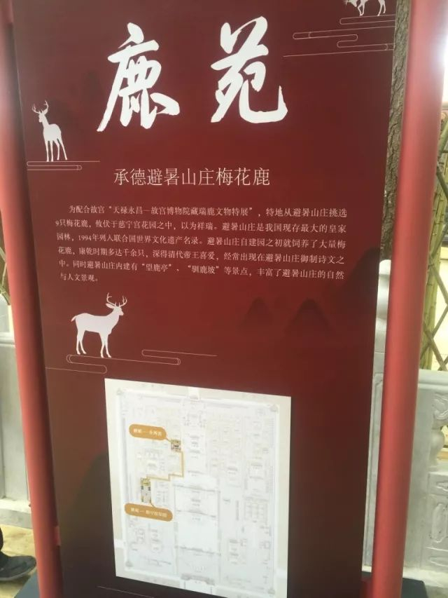 本次展览分为两个场地,慈宁宫花园是活鹿的展示。故宫博物院与承德市文物局合作,特地从避暑山庄挑选9只活鹿,攸伏于慈宁宫花园之中,以为祥瑞。让人们在欣赏精美的文物的同时,一睹瑞鹿的仙姿,不仅补充了展览内容,也给观众带来了新的感受。