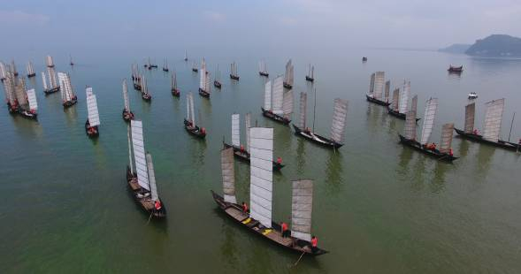 伴随嘹亮的号角声和震撼的锣鼓声,停泊在古滇艺海大码头栈桥外的数百艘人力帆船同时升起风帆,驶向滇池,展现了“百舸入滇,千帆竞发”的壮丽景象。