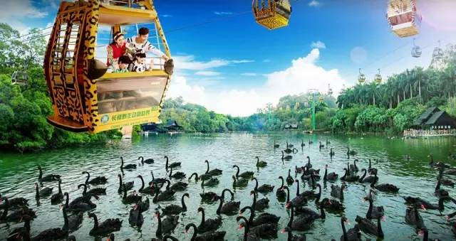 从北门进入,首先印入眼帘的是天鹅湖,这人工的天鹅湖立马把你带到亚马逊的丛林之中了。之前在项链上看到天鹅的造型,在这里看到这么多白天鹅和黑天鹅成群出现在你眼前,总有种不太真实的感觉。事实上,在长隆内的动物已经形成种群了,比北京等其他动物园强太多了。