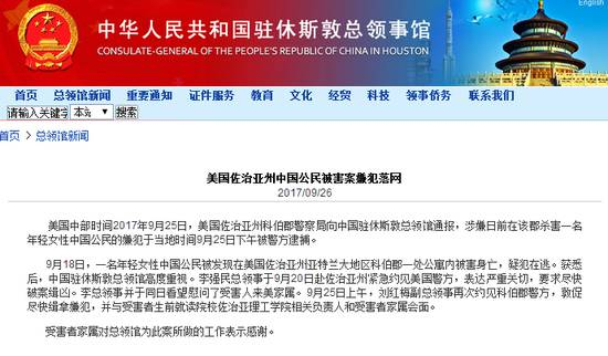据中国驻休斯敦总领馆网站消息,美国中部时间2017年9月25日,美国佐治亚州科伯郡警察局向中国驻休斯敦总领馆通报,涉嫌日前在该郡杀害一名女性中国公民的嫌犯于当地时间9月25日下午被警方逮捕。