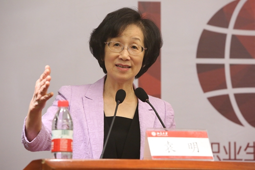 随后,袁明教授作“大国青年的国际担当”专场讲座。她首先肯定了开设“大学生职业生涯规划(走向国际组织)”课程的意义,认为国际组织人才培养工作对于当下的中国来说至关重要。随后,袁明教授以中国人民银行副行长朱民及北大党委书记郝平为例,介绍了他们在国际组织任职的经历。袁明教授指出,以他们为优秀代表的国际组织中的中国人,以丰富的知识储备和深厚的民族情怀为支撑,用自身的气度、修养与表达,在国际事务中展现了大国代表的风采,是值得青年学子学习的楷模。为了让大家进一步了解全球化形势下“中国担当”的具体所指,袁明教授引用了2017年1月17日习总书记在瑞士达沃斯年会上的讲话并指出,总书记的这篇讲话分量极重,言辞朴实而立意高远,其中蕴含着中国人“天行健,君子以自强不息”的精神。面对全球化带来的种种挑战,中国应当不怕困难地继续往前走;中国要做负责任的大国,就要给全世界一个信号“中国要怎么走”;而中国青年要有担当,首先就要从心底里认识到全球化的难处,认识到中国应当承担的责任。