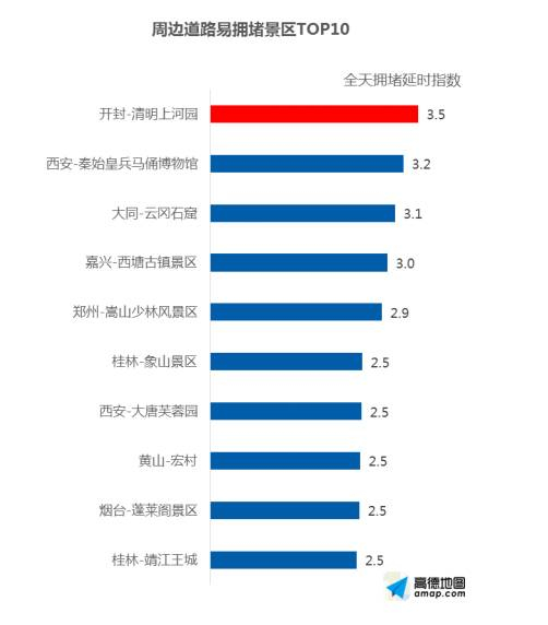 预计十一黄金周期间,开封清明上河园周边道路最为拥堵,,10月2日至7日的8:00~19:00时段拥堵最为突出。西安秦始皇兵马俑博物馆和大同云冈石窟将分全天拥堵延时指数排名二、三位,最拥堵时段分别为10月2日至7日的7:00~18:00,10月2日至5日的9:00~18:00。接下来依次为嘉兴西塘古镇、郑州嵩山少林寺、桂林象山景区、西安大唐芙蓉园、黄山宏村、烟台蓬莱阁和桂林靖江王城。