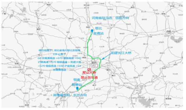 G4京港澳高速从孝感互通转入G70福银高速,从横店互通转入G42沪蓉高速,通过阳逻长江公路大桥转入G50沪渝高速,行驶至武汉南互通转入G4京港澳高速,抵达湖南境内。