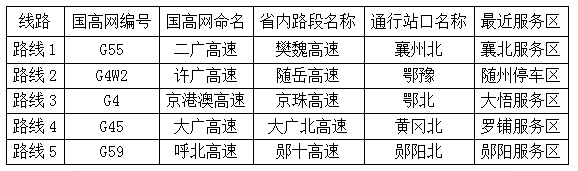 大广、京港澳、随岳、二广高速公路在我省境内基本为南北方向平行走向,互为复线,前往湖南、河南方向,可以视情选择这几条路线。
