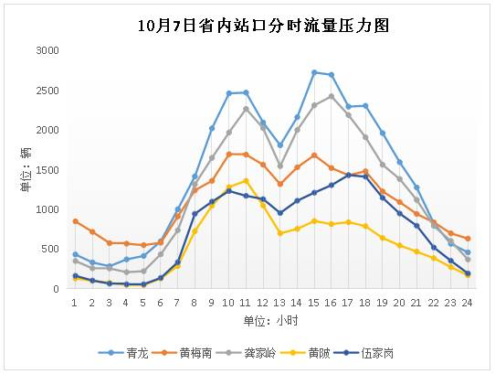以2016年国庆期间省内高速最繁忙的5个收费站口为样本,分析国庆假期流量高峰的集中时段,主要在9-11时,15-18时。