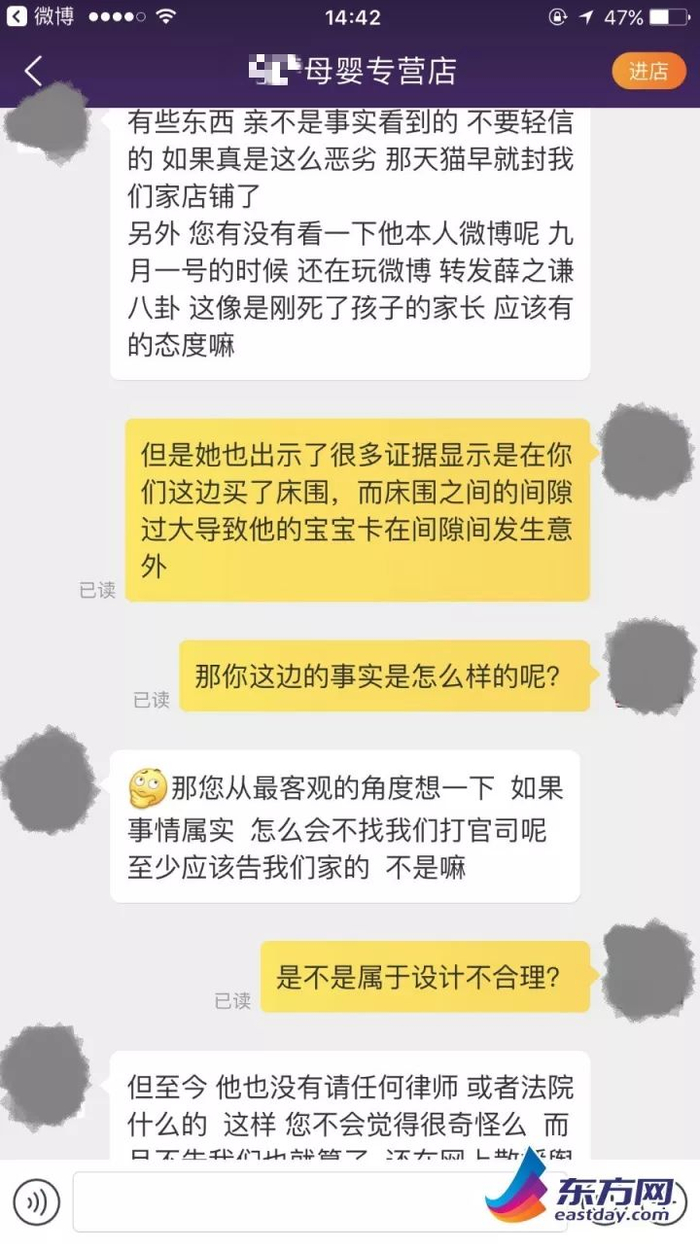 今天下午,记者在淘宝上发现该事件中床围的商家——某母婴专营店已经把涉事的幼儿护栏大床围下架了,表明想了解“床围事件”的情况后,天猫店客服立即否定了这件事情的真实性,“有些东西,亲不是事实看到的。不要轻信,如果真是这么恶劣,那天猫早就封我们家店铺了。”