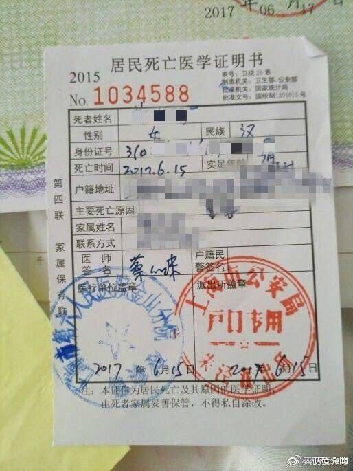 △上海第六人民医院金山分院开的居民死亡医学证明书