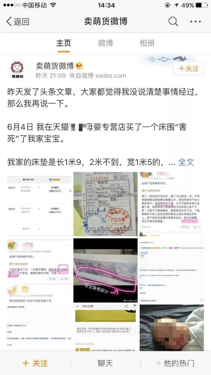 “这之后的2个多月,我都是沉浸的无数的自责当中,如果我一直陪着她就不会这样,如果我没买这个东西不会这样,如果我让她睡在小床上就不会这样。可惜如果没有意义。”宝宝的爸爸在微博上写道,自己当时心情极度悲痛,所有关于宝宝的东西基本上都扔了烧了,包括这个床围,所以没有图片了。