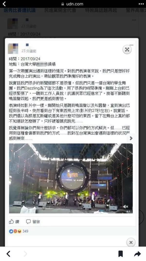 原本是一场普通的两岸音乐交流会《2017<中国新歌声>上海•台北音乐节》,因为有人故意把这场民间的两岸音乐交流节目进行“泛政治化”操作,导致演唱会在进行的过程中遭遇台独团体的鸣笛、喷漆、撒冥纸,甚至扔烟雾弹的到舞台上的状况,导致活动无法举行,最终校方以安全的角度出发,提前结束了这场原本计划8小时的音乐会。