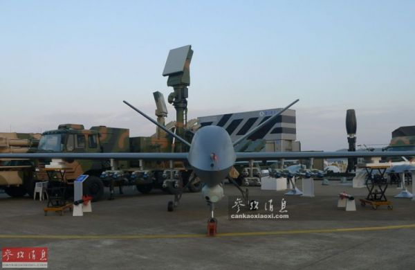 资料图片:珠海航展上以满挂载武器状态展示的“彩虹”-5攻击型无人机。