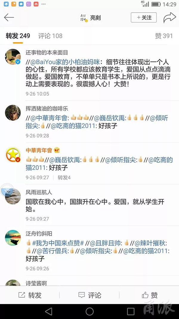 “细节往往体现一个人的心性,所有学校都应该教育孩子,爱国从点点滴滴做起。爱国教育,不单单只是书本上所说的, 更是行动上需要表现的,很震撼人心!大赞!”许多网友为照片中的小学生们点赞、留言并转发。截至记者发稿,这张照片已经刷爆微博,点击量达到12.5万,点赞数391个。