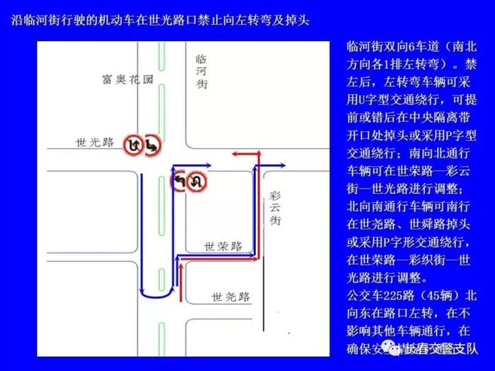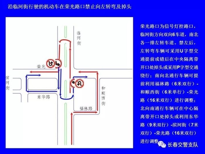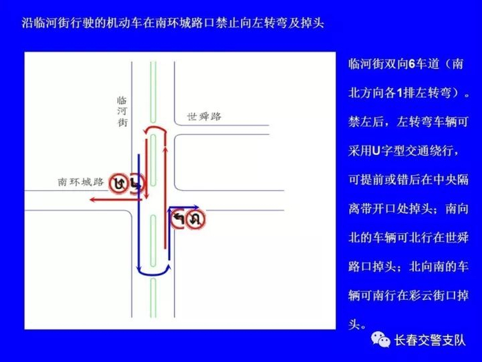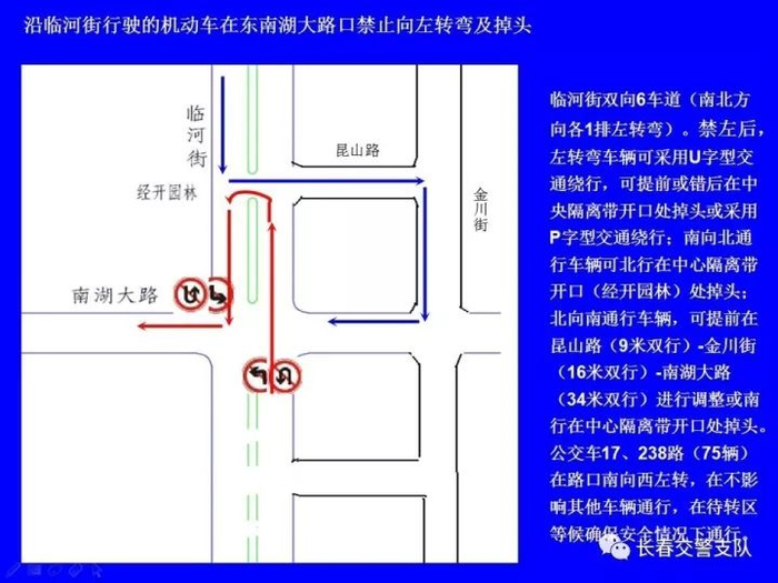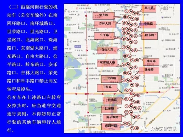 2、沿临河街行驶的机动车(公交车除外)在南四环路口、南环城路口、世荣路口、世光路口、卫星路口、北海路口、珠海路口、东南湖大路口、浦东路口、自由大路口、公平路口、岭东路口、安乐路口、吉林大路口、荣光路口和阜丰路口禁止向左转弯及掉头。